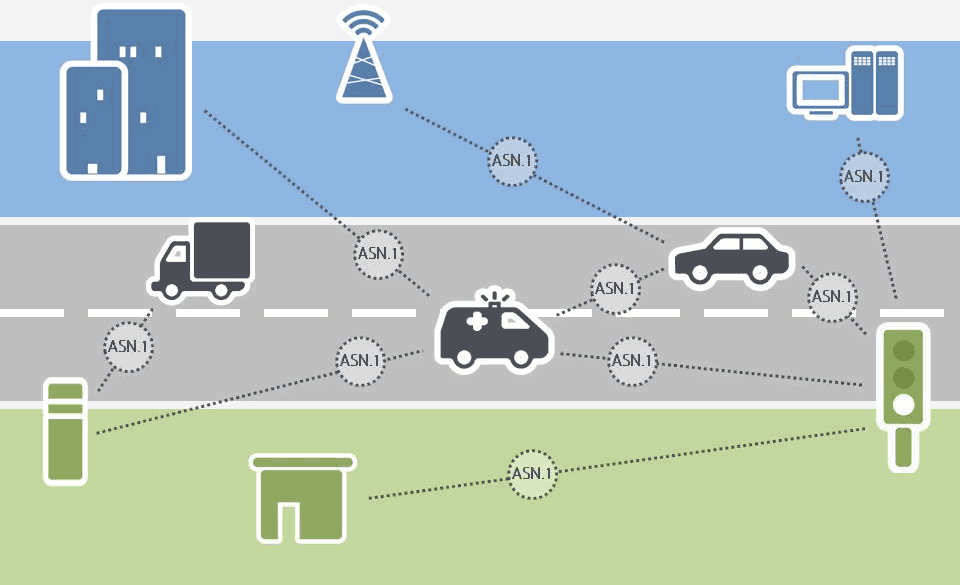 使这成为可能的技术称为专用短距离通信 (DSRC)。 DSRC 涉及无线通信,意味着带宽有限。 消息需要简短并快速交换。这就是 ASN.1 的用武之地。通过 DSRC 传输的消息是使用 ASN.1 指定的,并且使用 ASN.1 八位字节编码规则 (OER) 进行小型化和快速传输。 OER 的使用允许许多车辆相互传递有关该地区的道路和交通状况以及行驶方向的短消息。 这些消息可能包含来自其他车辆、交通信号灯或路边警告标志等的信息。这种级别的通信意味着可以警告高速公路上的司机,当他们目前以 55 英里/小时的速度行驶时,所有交通 前方 1 或 2 英里的速度低于 15 英里/小时,他们应该准备好快速减速。